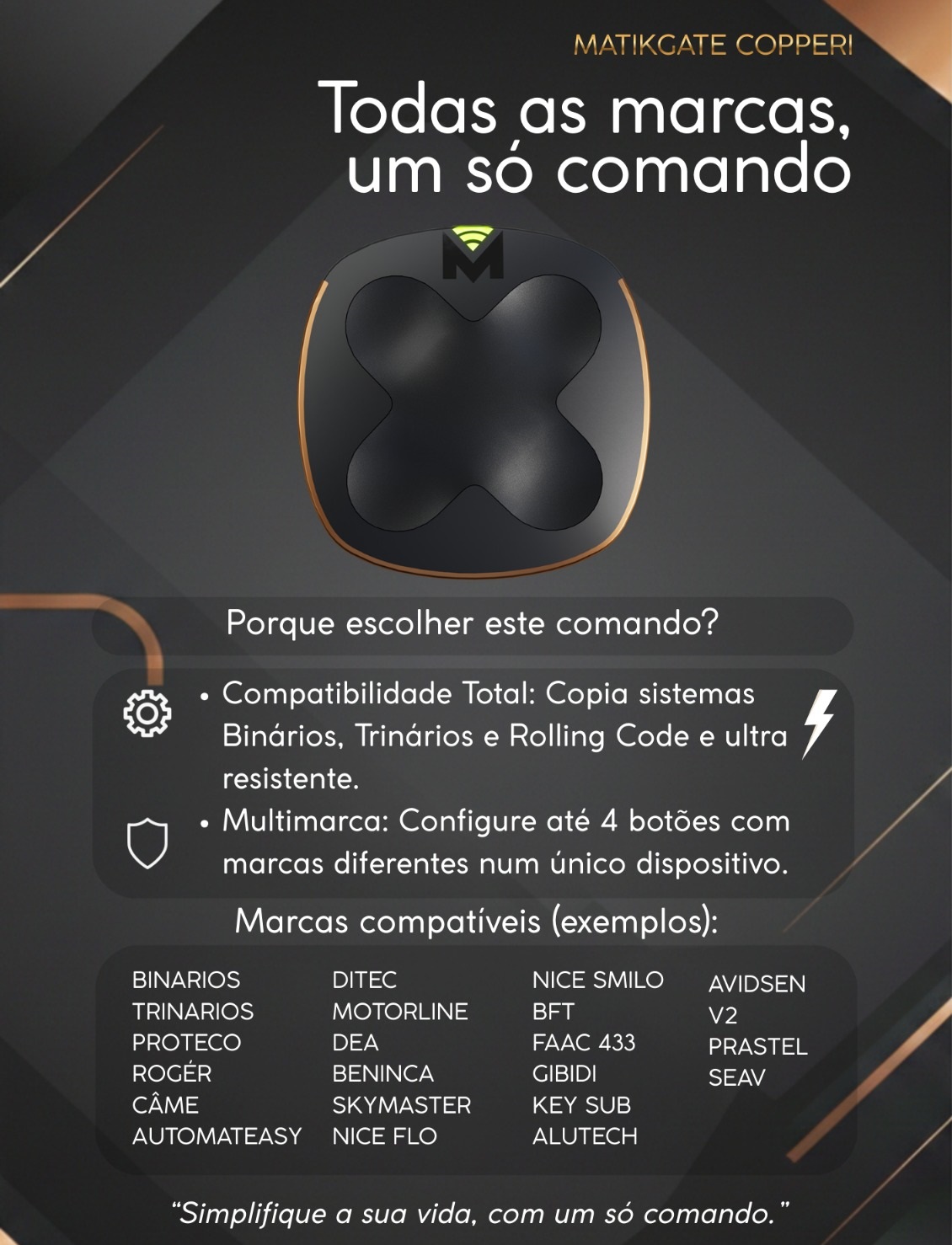 • Comando Multimarcas Matikgate Copper, permitindo 4 em 1 (4 marcas diferentes em 1 comando), 433.92MHz.
