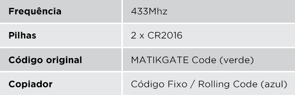• Frequência de 433.92 MHZ, tipo rolling code e fixa.