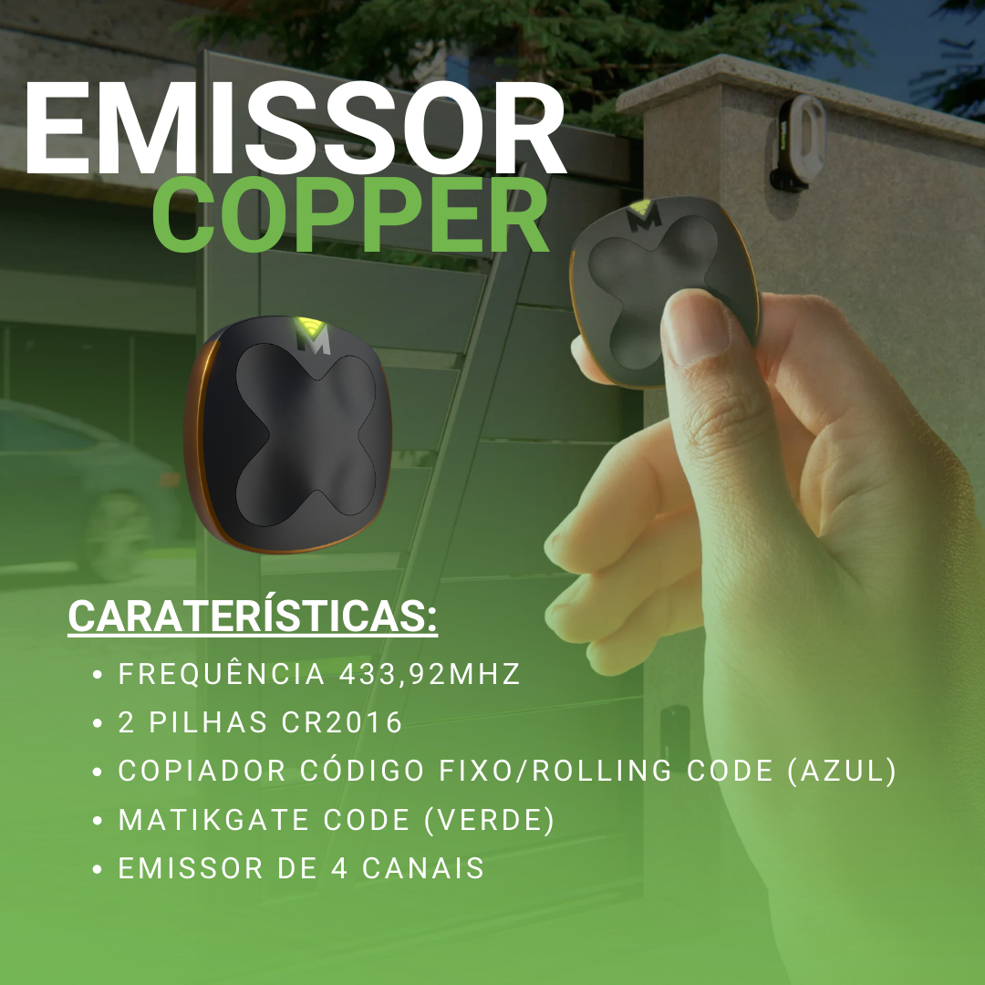 O lançamento do COPPER marca uma revolução no controlo de automatismos da MATIKGATE, oferecendo uma solução inovadora e eficiente para residências e empresas. Com um design, compacto, moderno e elegante, na qual se destaca a sua estrutura metálica de cor cobre, este emissor pode ser integrado em qualquer ambiente, sem comprometer a estética.